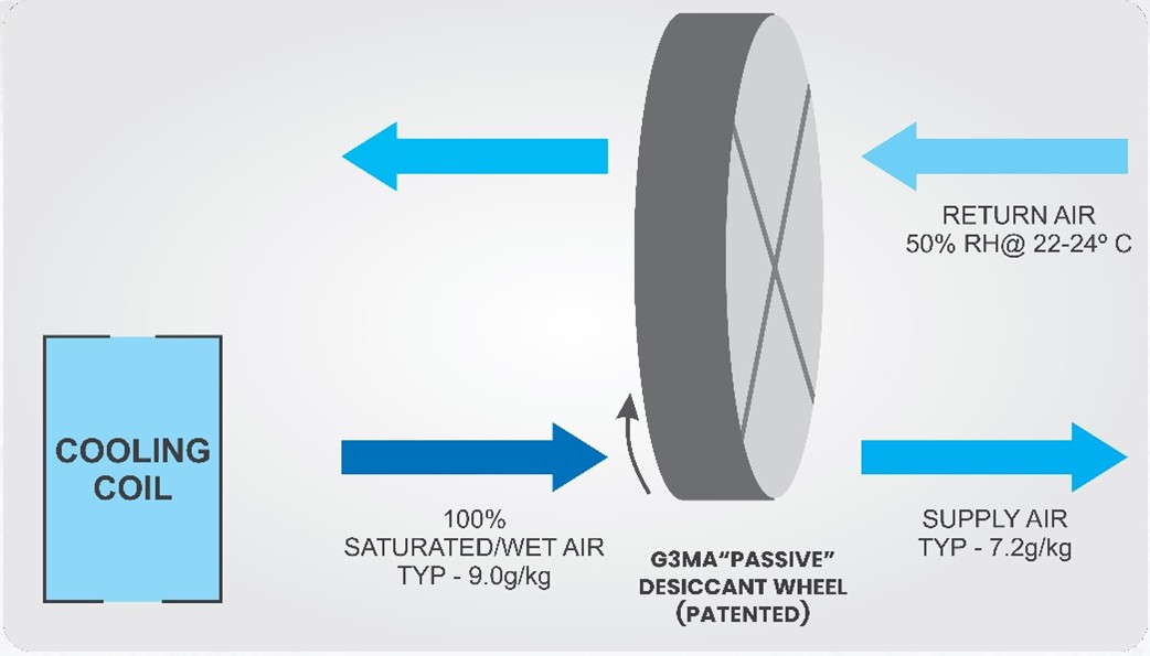 DRI의 G3MA 패시브 데시컨트 제습 휠은 재생 에너지를 소비하지 않고도 효과적인 제습을 제공하도록 설계된 특허 보호 기술입니다. 기존 데시컨트 시스템과 달리, G3MA 휠은 약 50% 상대습도의 실내 리턴 공기를 이용해 자연적으로 재생되므로, 에너지 효율적인 신선 공기 처리에 이상적인 솔루션입니다.